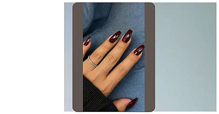 And can we talk about that ring? It’s like a tiny firework display next to those stunning nails. Together, they’re a total power combo. The dark burgundy and the sparkling diamonds complement each other flawlessly. You’d never guess how easy it is to achieve this look (okay, maybe you would if you’re a nail art pro, but for the rest of us… it’s a dream!). It’s definitely an outfit upgrade, no matter what you’re wearing, from jeans to a sparkly dress.