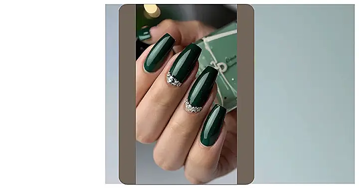 Forget plain old green – these nails are way more fun! That gorgeous deep green color is totally captivating, like staring into a really, really pretty swamp. But the best part? Those dazzling little crystals! They add a touch of extra magic, like tiny stars have fallen onto your fingertips. Seriously, these nails are the perfect mix of spooky cool and sparkly fabulous – get ready to rock them!