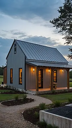 Picture yourself chilling on that cute porch as the sun goes down. Those warm lights look super inviting, like the house is giving you a friendly hug. This little barndominium feels like the ultimate cozy hideaway, maybe somewhere you could actually hear yourself think, or just listen to crickets chirping. It shows that even a small space with a barn twist can feel super welcoming and ready for some serious relaxing, maybe with a cup of hot chocolate or a good book.