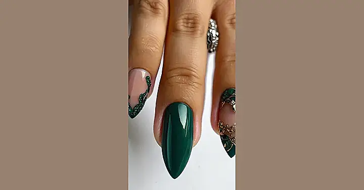 And guess what? These nails are way easier to achieve than you might think. Forget about complicated nail art; a single coat of this rich, deep green and a sprinkle of glitter is all you need to transform your hands into a magical masterpiece. So ditch the boring and go green – your nails deserve this sophisticated, yet secretly playful, look!