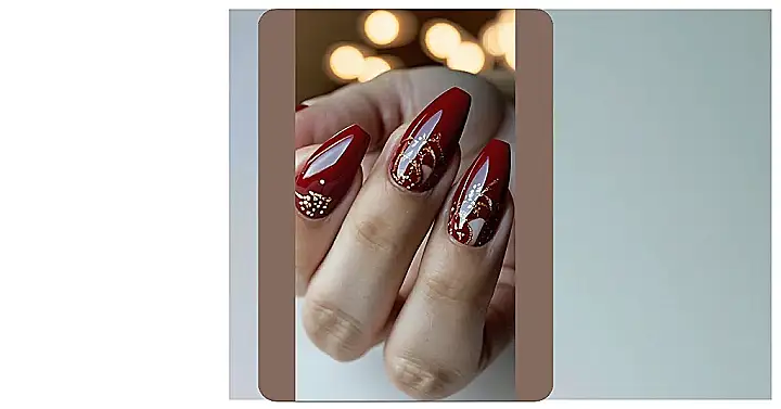 These red nails are seriously giving off some fancy vibes! It’s like, imagine dipping your nails in a pot of liquid ruby, and then sprinkling them with actual gold dust. It’s the kind of look that says, “I might be doing homework right now, but I could also be attending a super swanky party later.” They’re definitely a step up from the chipped polish I usually rock, but hey, a girl can dream, right?