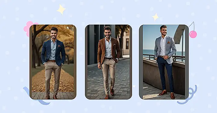 Thinking about men’s blazer outfits is basically thinking about how to look sharp but still comfortable. You don’t need a full suit to look good. A blazer lets you mix and match, like the khaki pants in the picture, making it perfect for tons of different times. It’s your secret weapon for feeling confident, whether you’re hanging out, going to something semi-important, or just want to prove you know how to put clothes on in a way that impresses people.