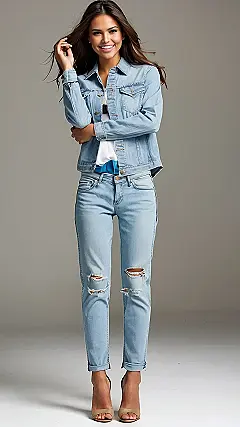 Who needs a tiara when you have a pair of perfectly distressed jeans? This outfit is proof that comfort and style can totally coexist. The light wash denim on both the jacket and the jeans is super fresh and flattering, and those cuffed jeans add a touch of “I woke up like this, but actually, I put a lot of thought into this look” magic. Seriously, this is the perfect blend of casual cool and put-together polish – making a statement without even trying too hard.