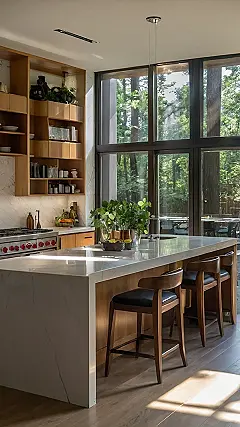 This kitchen is seriously goals! Imagine waking up, making breakfast, and having a whole forest staring right back at you through those giant windows. It’s like you’re cooking in a nature documentary, but instead of a grumpy bear, you’ve got a super sleek island and stylish bar stools. The modern design is fancy, but also feels so comfy and inviting – it’s the perfect blend of sophisticated and snug!
