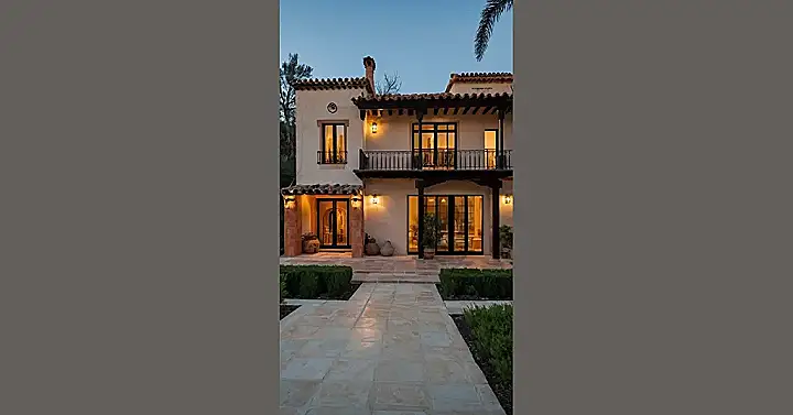 The entryway is super cool too, with that mosaic-looking pathway. It’s way more interesting than just plain concrete. Plus, those plants in the terracotta pots are like little welcome signs saying, “Hey, come on in and enjoy the good life!” Spanish style houses definitely have a way of making you feel like you’re on vacation, even if you’re just taking out the trash.