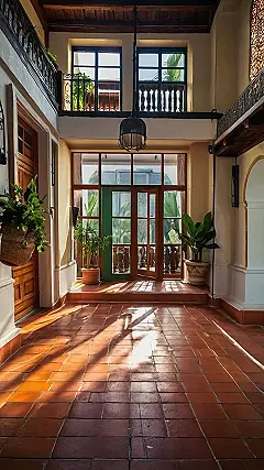 Imagine waking up in this Spanish-style house! Those terracotta tiles on the floor look like giant chocolate squares, and the sunlight streaming in just begs you to grab a churro and a café con leche. It almost feels like you’re on vacation, even if you’re just heading downstairs for breakfast. Watch out, though, those plants look like they might be plotting a takeover of the whole place!