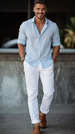 Want to beat the heat and still look cool? Check out this look! This guy’s rocking a light button-down shirt that’s perfect for those hot summer days. It’s giving off major chill vibes, like he’s ready to hang out at a beach bonfire or maybe just grab some ice cream with friends. Plus, you can roll up the sleeves for extra coolness (literally!).