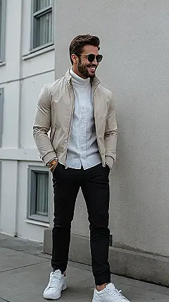 This guy is totally rocking the winter fashion scene! His cream jacket is the perfect way to stay warm and stylish. It’s like a hug for your body, but way cooler. The white turtleneck and black pants are classic choices, but he adds a little personality with his cool sunglasses and white sneakers. He looks like he’s ready to take on the world (and maybe even find a warm spot to sip some hot chocolate).