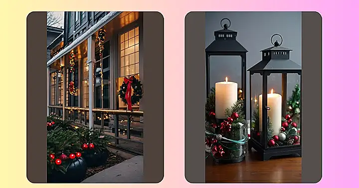 These aren’t your grandma’s Xmas decorations! Check out these super stylish lanterns, all decked out for the holidays. They’re like little glowing houses for candles, surrounded by festive greenery, shiny ornaments, and enough red to make Santa blush. It’s the perfect blend of cozy and chic, making your home instantly feel warm and ready for some serious holiday fun.