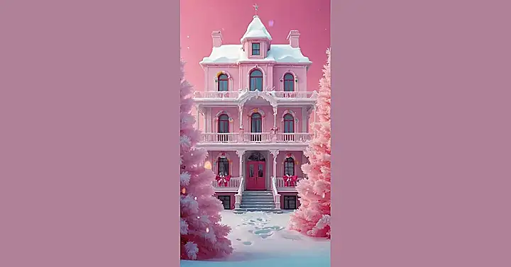 **Paragraph 1:** OMG, check out this house! It’s like a giant, sugary pink gingerbread house straight out of a Christmas dream, only way more awesome. It’s totally decked out for the holidays, all snowy and sparkly, with pink Christmas trees guarding the entrance. I bet Santa’s elves had a blast decorating this place – imagine the amount of pink frosting they used! It’s so cute, it almost hurts! You could totally use this picture as the most fabulous Christmas wallpaper ever.