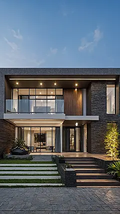 See all those giant windows and cool balconies? That’s not just for show (though they look pretty sharp). It’s part of the design magic that makes the inside feel bright and airy. Plus, you get awesome views! And check out the entrance path with the stones and perfect lighting – it’s like a red carpet just for getting your pizza delivery. This house architecture design is all about making every part look good and feel like a totally cool place to live, even if you’re just judging by the outside and dreaming about the inside!
