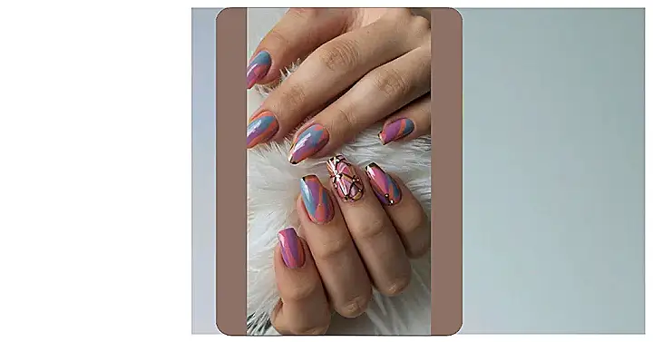 These nails are so cool, they’re like if Lisa Frank and a fancy art museum had a baby! Seriously, those swirly colours look like a modern art masterpiece, and that one nail with the gold criss-cross design? Total boss-mom vibes! I bet this mom can juggle school drop-offs, grocery shopping, and a board meeting all while rocking these amazing nails.