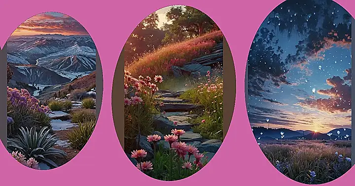 Seriously, though, this would make the best background for your computer, tablet, or even your locker! The colours are amazing – all those soft pinks and purples at sunset, and then these little magical glowing flowers that look like they’re dancing in the sky and field. It’s like someone took a gorgeous sunset, added some fairy dust, and then sprinkled in a million wishes. It’s so dreamy and peaceful, you’ll feel instantly calmer every time you look at it.