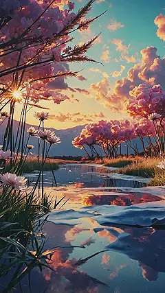This picture is like a dream! Imagine a place where fluffy pink trees meet a calm, glassy pond, all under a sunset so vibrant it looks like it was painted by a unicorn. It’s totally awesome, right? Those pastel pink blossoms and the way the clouds are reflected in the water make it the perfect background for your phone or laptop. You’ll want to stare at it all day – it’s seriously that pretty! It’s the kind of image that makes you want to grab your sketchbook and try to capture its magic, or maybe even pack a picnic and go find your own real-life version!