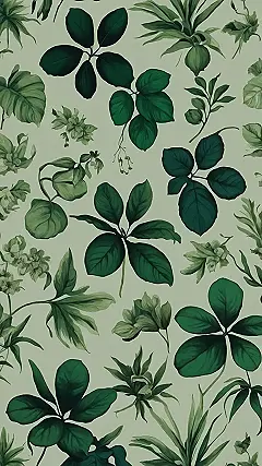 This wallpaper is like a green explosion! It’s got leaves everywhere, and they’re all different shapes and sizes, like they’re playing hide-and-seek. It’s like a jungle party happening on your wall. It’s a total vibe.