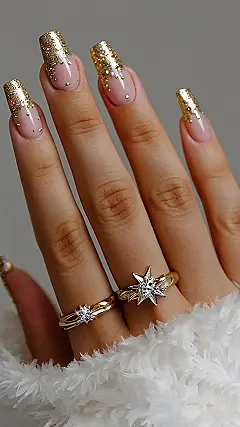 **Paragraph 1:** OMG, check out these nails! They’re totally Christmas-ready, even if it’s still early December. Imagine yourself sipping hot cocoa by the fireplace, wearing your cozyest sweater (like the one in the pic!), and showing off these gorgeous, glittery gold nails. They’re like tiny little Christmas trees on your fingertips, all sparkly and festive. I bet everyone will be asking where you got them done! They’re so fancy, they even make simple rings look like royal jewels.
