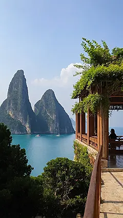 And check out that cool little chill spot! Seriously, someone knew what they were doing when they put that gazebo right there, complete with a railing that looks like it’s inviting you to lean and stare. The person relaxing there has the right idea – just soaking up the vibes and the amazing scenery. It’s the perfect combination of natural beauty and a comfy-looking place to just hang out. Forget stressing about homework for a bit; this view is the ultimate aesthetic therapy session. You could probably even convince yourself the boats are little plot points in the epic story unfolding before you.