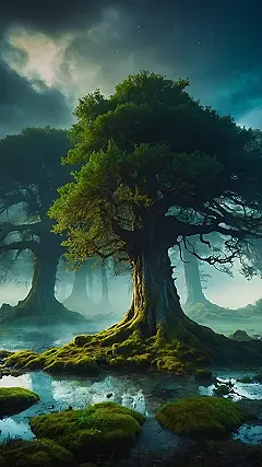 This picture is like stepping into a fairytale! Imagine walking through a forest so thick, the sunlight barely reaches the mossy ground. You can almost hear the whispers of the trees and the gentle gurgle of the creek flowing through the mystical landscape. It’s a world where anything is possible, and you can’t help but feel a little bit of magic in the air.