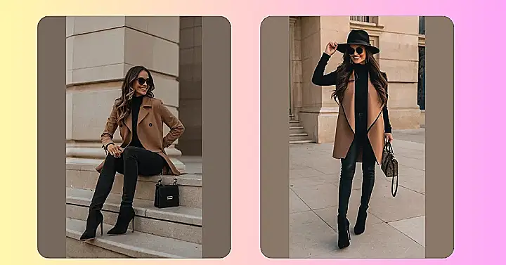 This outfit is perfect for a fall night out! It’s comfy, stylish, and warm enough to keep you cozy even when the air gets chilly. The brown coat is a classic fall choice, and it looks great paired with black jeans and a turtleneck. The ripped jeans add a little bit of edge, and the boots make the whole outfit look put-together. You’ll feel confident and ready to take on the night in this outfit, even if it’s just a trip to the movies with your friends.