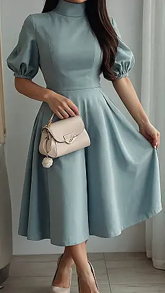This outfit is giving serious “Bonjour, I’m here to stroll the Champs-Élysées” vibes. It’s all about that classic European fall look: elegant, effortless, and totally chic. The powder blue dress is so pretty, and those puffy sleeves? Pure perfection! They’re like little clouds, but way more stylish. And let’s not forget the tiny handbag – it’s just begging to be filled with croissants and a good book.
