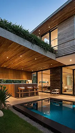 Looking at this place, it’s like someone designed a building specifically for maximum chill. Those cool wooden arches make the house look like it’s doing yoga, and the roof looks like it’s wearing a giant straw hat, which is pretty relatable on a hot day. With all that glass, you could probably wave hi to a passing dolphin while making breakfast, which is way better than arguing with your alarm clock, just saying.