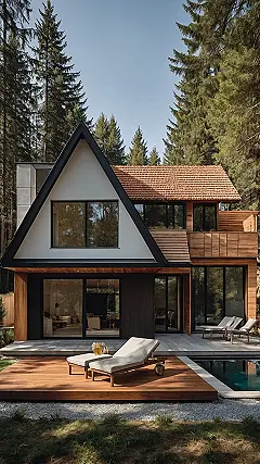 This house looks like it hired a fancy stylist who really loves trees! Forget those boring square boxes; this place is rocking a seriously cool triangular roof that fits right in with the pointy tops of the giant evergreens around it. It’s like a modern art piece decided to become best friends with a forest, using all that gorgeous wood to blend in (but still totally stand out). You could probably convince a squirrel this was just a really, really big nut.