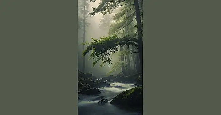 This picture is like a scene from a fairytale! Imagine walking through this misty forest, the air cool and damp against your skin. The trees are so tall that their branches reach up into the clouds, almost like they’re trying to touch the sky. There’s a little river winding its way through the forest, bubbling over rocks like it’s singing a secret song. You can almost hear the whispers of the wind through the trees and the soft rustle of leaves under your feet. It’s the perfect place to get lost in your thoughts and escape the hustle and bustle of everyday life.