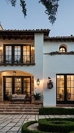 This house is seriously stunning! Just look at that gorgeous white exterior, those charming brown doors, and that super fancy balcony. It’s like something straight out of a movie, all sunshine, terracotta tiles, and a definite “siesta” vibe. It’s the perfect example of a Spanish Mediterranean home, the kind you might imagine a wealthy family from a sunny coastal town living in—maybe with a pet donkey named Paco.