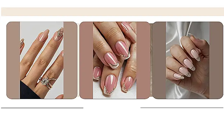 Check out these specific nails though – they’re not just any old manicure! They’ve got this cool V-shape thing going on at the tip instead of the usual straight line, rocking a sweet pink base that looks like it belongs on a cotton candy cloud. But the real secret sauce? That delicate gold line outlining the tip and the little sparkly gold bits. It’s like adding a touch of fancy jewellery just for your nails. They scream “I’m put-together but I’m also here for maximum summer chill,” which is basically everyone’s goal, right?