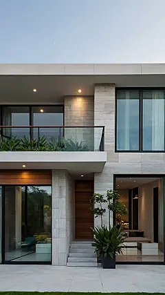 This house looks like something straight out of the future, but with a touch of nature trying to sneak in! You can see those cool, modern lines and big windows practically begging for some sunlight. It’s almost like the house is saying, “Yeah, I’m fancy, but I still appreciate a good houseplant.” Hopefully, the owners remember to water them!