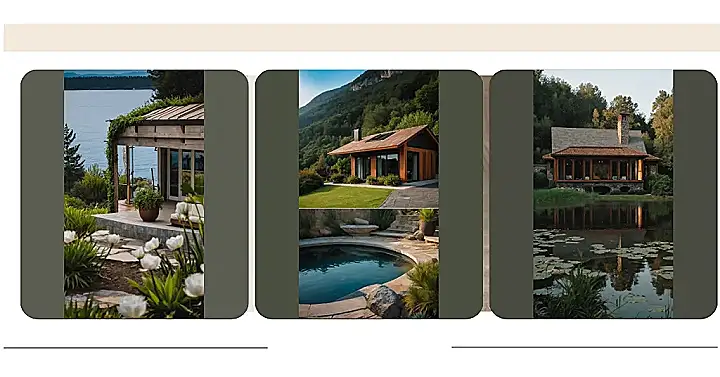 This beautiful house looks like it’s straight out of a fairytale! It’s got a charming wooden roof and those big windows, they look like they’re just waiting for someone to peer in and see what secrets lie inside. But the most magical part? That little pond in front of the house! The water is so still, it’s like a giant mirror reflecting the house perfectly. Maybe it’s even got a little mermaid living in it!