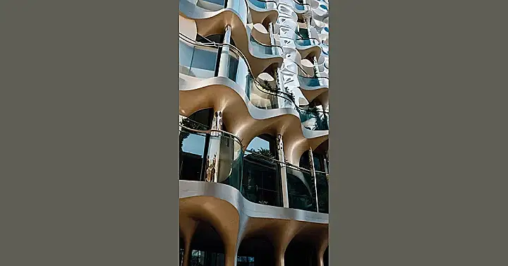This building looks like it’s been through a blender! It’s like someone took a regular building and gave it a big, squishy hug. The balconies are all wavy and curvy, like they’re made of melted chocolate. “Organic architecture” means that the building looks and feels natural, just like a tree or a flower. It’s super cool how the building is designed to follow the shape of its surroundings, almost like it’s growing right out of the ground!