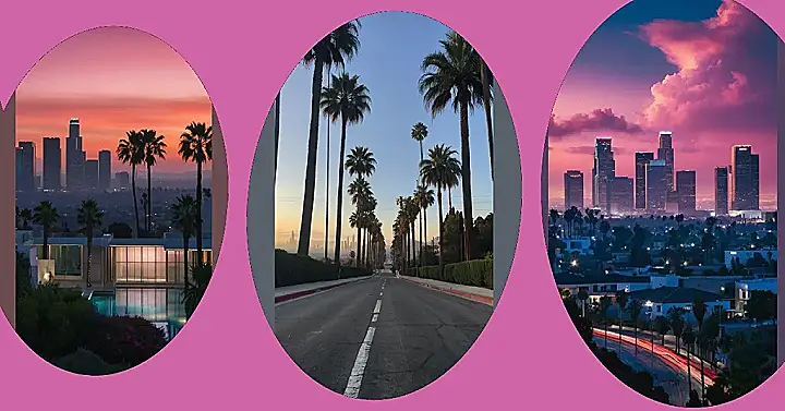 This photo is like a movie scene! Imagine cruising down a street in LA, those iconic palm trees lining the road like they’re waving hello. The sky’s this gorgeous purple-pink, and in the distance, the city’s skyscrapers are all lit up like sparkly jewels. It’s totally the perfect Los Angeles aesthetic, capturing that chill vibe with a touch of glamorous city life – like a postcard from a dream vacation, but way cooler.