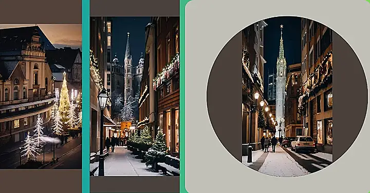 This photo makes you feel like you’re strolling down a cozy European street during Christmas time. The snow is sparkling, the buildings are lit up like a gingerbread house, and the Christmas trees are glowing with twinkling lights. It looks like a scene straight out of a holiday movie, and you can almost imagine the smell of roasted chestnuts and hot chocolate in the air.