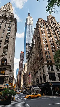 Look at this classic New York City scene all warmed up for summer! The Empire State Building is standing tall in the distance, probably wishing it could wear shorts. Down below, the streets are packed with those iconic yellow cabs buzzing around like giant, noisy bumblebees, trying to beat the heat and maybe score the next fare before the light changes. It feels like the whole city is just radiating warmth, making the tall buildings feel even taller as they try to offer a tiny bit of shade.