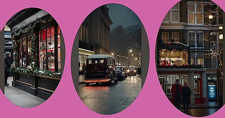 Two friends, bundled up against the London chill, stroll past a shop decked out for Christmas. Fairy lights twinkle like mischievous stars, reflecting off the glistening windows. The shop’s display looks like a scene from a Christmas movie – all cozy fireplaces and jolly Santas. It’s the kind of place where you’d expect to find magically shrinking sweaters or self-stirring hot chocolate (maybe they do, who knows!). It’s pure Christmas magic, and even these two guys seem to be caught in its spell.