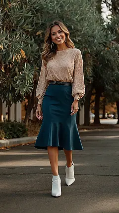This outfit is totally giving us fall vibes! The flowy beige skirt looks so comfy and stylish. Imagine twirling through a pile of crunchy leaves in this look. And that light blue shirt? Perfect for layering with a cozy sweater when the air starts to get nippy. It’s a great outfit for a casual day out with friends, or maybe even a date at the pumpkin patch!