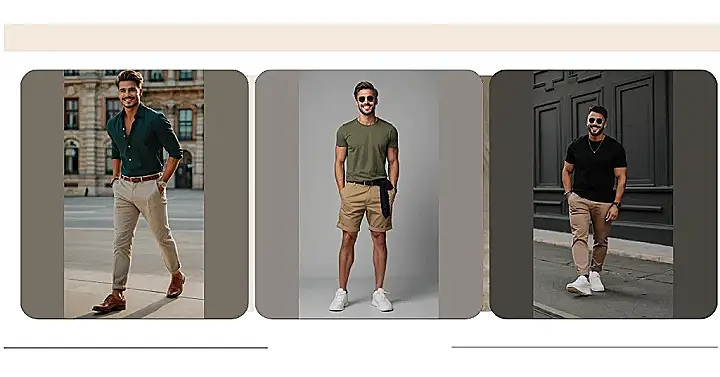 This guy’s outfit is seriously chill! Imagine strolling through a park on a sunny day, maybe grabbing an ice cream cone – this is the perfect look. Those khaki shorts are super comfy and stylish, paired perfectly with a simple olive green t-shirt. It’s the kind of outfit you can throw on without thinking, and still look like you put in some effort (even if you didn’t!). Plus, the white sneakers add a fresh, clean vibe that’s perfect for any casual adventure. Forget about complicated outfits, this one is all about effortless cool.