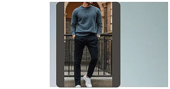 This guy’s totally rocking the casual look! See those dark-colored pants? They’re not your grandpa’s trousers – they’re sleek and stylish, perfect for hanging out with friends or impressing someone special. Paired with a comfy-looking sweater, this outfit is all about relaxed sophistication. Forget stuffy suits; this is the kind of outfit that says “I’m confident and comfortable in my own skin,” without trying too hard. It’s the ideal balance of dressed-up enough to look sharp but laid-back enough to feel good.