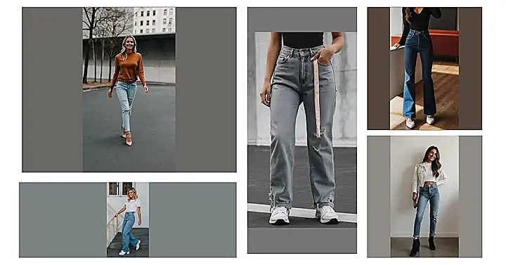 This picture shows off two awesome ways to rock straight fit jeans! See how a simple grey long-sleeved shirt can look super chic with a pair of perfectly fitting jeans? Whether you’re going for edgy with boots or fancy with heels, straight fit jeans are your best friend for a day out. They’re comfy, they’re stylish, and they go with practically anything – kind of like pizza, but way more fashionable.
