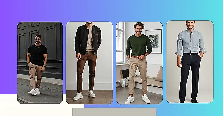 This guy’s totally rocking the casual look! He’s showing us how easy it is to look sharp without even trying too hard. Those khaki pants are the perfect match for a simple black t-shirt—it’s like a classic combination that never gets old, kinda like your favorite pair of jeans (but way cooler). Add some clean white sneakers and sunglasses, and boom! Instant style upgrade. He’s practically modeling the definition of “men’s pants casual outfit” – you can totally copy this for your next hangout!