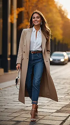 This outfit is giving us serious fall vibes! Imagine strolling down the street in a cozy beige coat, a crisp white shirt, and your favorite pair of jeans – just like this stylish lady. The coat is perfect for keeping you warm, while the jeans and shirt keep things casual and comfy. Plus, those heels add a touch of class so you’re ready for any autumn adventure, whether it’s a dinner date with friends or a trip to the pumpkin patch!