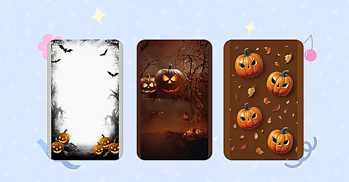 The background is like a cozy fall day, with warm brown hues and leaves scattered about, making you feel all cozy and warm. The pumpkins are the stars of the show, with their big, friendly eyes and goofy grins. It’s a fun and festive way to celebrate the season, without being too scary. So go ahead, give it a try and bring a little bit of Halloween magic to your phone!