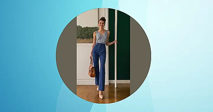 She’s rocking that Parisian style outfit like she *owns* the Eiffel Tower (which, TBH, maybe she does!). Those blue pants are the perfect length for a casual stroll along the Seine, or, let’s be real, posing for the ultimate Insta pic. That blazer and blouse combo is giving us major ‘cool art teacher in a rom-com’ vibes, and we are here for it!