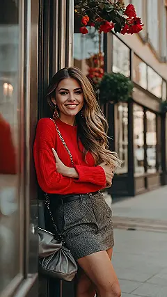 This girl is rocking the “casual dinner outfit fall” look like a pro! Her red sweater is totally cozy, and her skirt looks super comfy – perfect for a night out with friends. She’s even got a cute little purse to match. I bet she’s going to the best restaurant in town and is ready to have an amazing time. With that big smile on her face, she’s definitely feeling confident and ready to conquer the night.