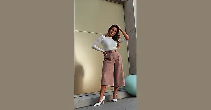 This outfit is perfect for any midsize girl looking to stay stylish this fall. The white long-sleeved shirt is super comfy and can be dressed up or down, and the wide-leg pants are the ultimate in chic comfort. Plus, those white heels add a touch of sophistication that’s perfect for a day out or a night on the town.