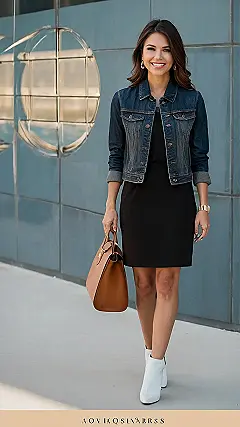 The image shows a lady rocking a totally cute outfit that would be perfect for transitioning from summer to fall! It’s a little bit classic, a little bit edgy, and definitely perfect for those midsize ladies who want to feel confident and stylish. She’s got on a classic black dress that looks super comfy, but then she’s amped it up with a denim jacket and white boots. It’s like she’s saying, “I’m all about that casual chic look, and I’m not afraid to mix and match!”