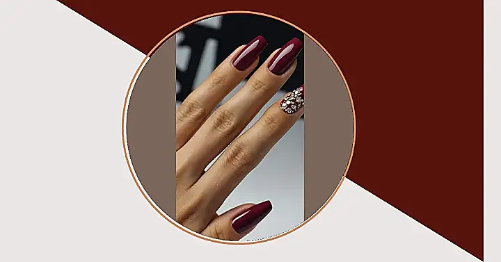 This manicure is giving us major “winter wonderland” vibes! Imagine a snowy night, twinkling with lights, and a beautiful, dark sky above. That’s what this deep, burgundy nail polish reminds us of, and the sparkly little jewels are like the tiny lights that make the whole thing pop! It’s almost like a glamorous, grown-up version of those festive, glittery snowflakes you used to make in elementary school.