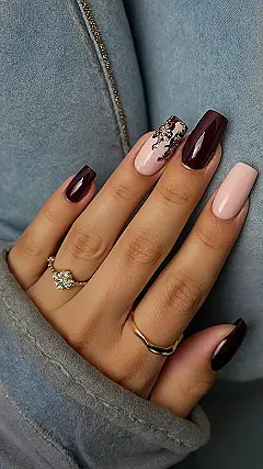 These nails are giving us all the cozy vibes of a winter wonderland! They’re like a mini-vacation for your fingertips. From the deep burgundy red to the delicate pink and sparkly gold accents, these nails are the perfect way to add a little bit of sparkle and sophistication to your winter look. Imagine sipping hot chocolate by the fireplace with these on – talk about a chic winter wonderland!