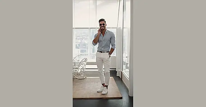 Want to look effortlessly cool without trying too hard? Just check out this guy! He’s rocking the “I woke up like this” vibe, but we all know it takes a little more effort than that. His light blue shirt and white pants are like a blank canvas – easy to mix and match with other stuff you already have. You don’t need to buy a whole new wardrobe to be stylish. Just grab some basics, pay attention to the fit, and boom – you’re looking sharp!